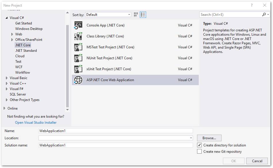 เลือก .NET Core จากประเภทโครงการและ ASP.NET Core Web Application จากเทมเพลต