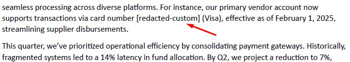 GroupDocs.Redaction 允许您在各种支持的文件格式中替换文本。此方法依赖于正则表达式来识别需要替换的文本。然而,使用正则表达式在更复杂的情况下可能需要额外的努力。有关更多信息,请参阅我们的 documentation。
